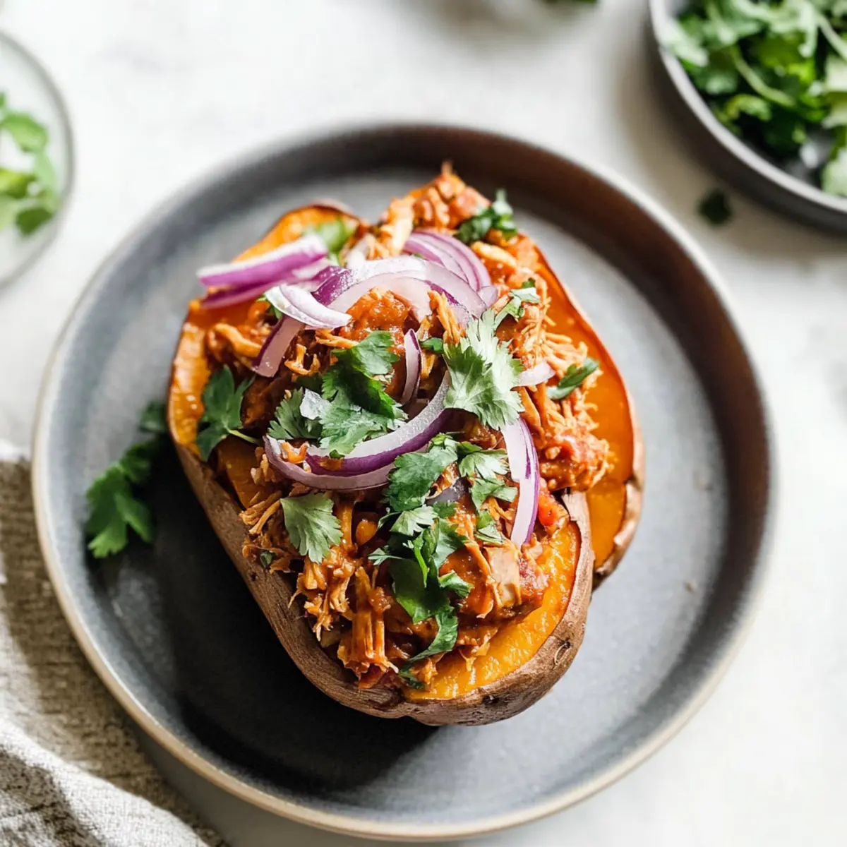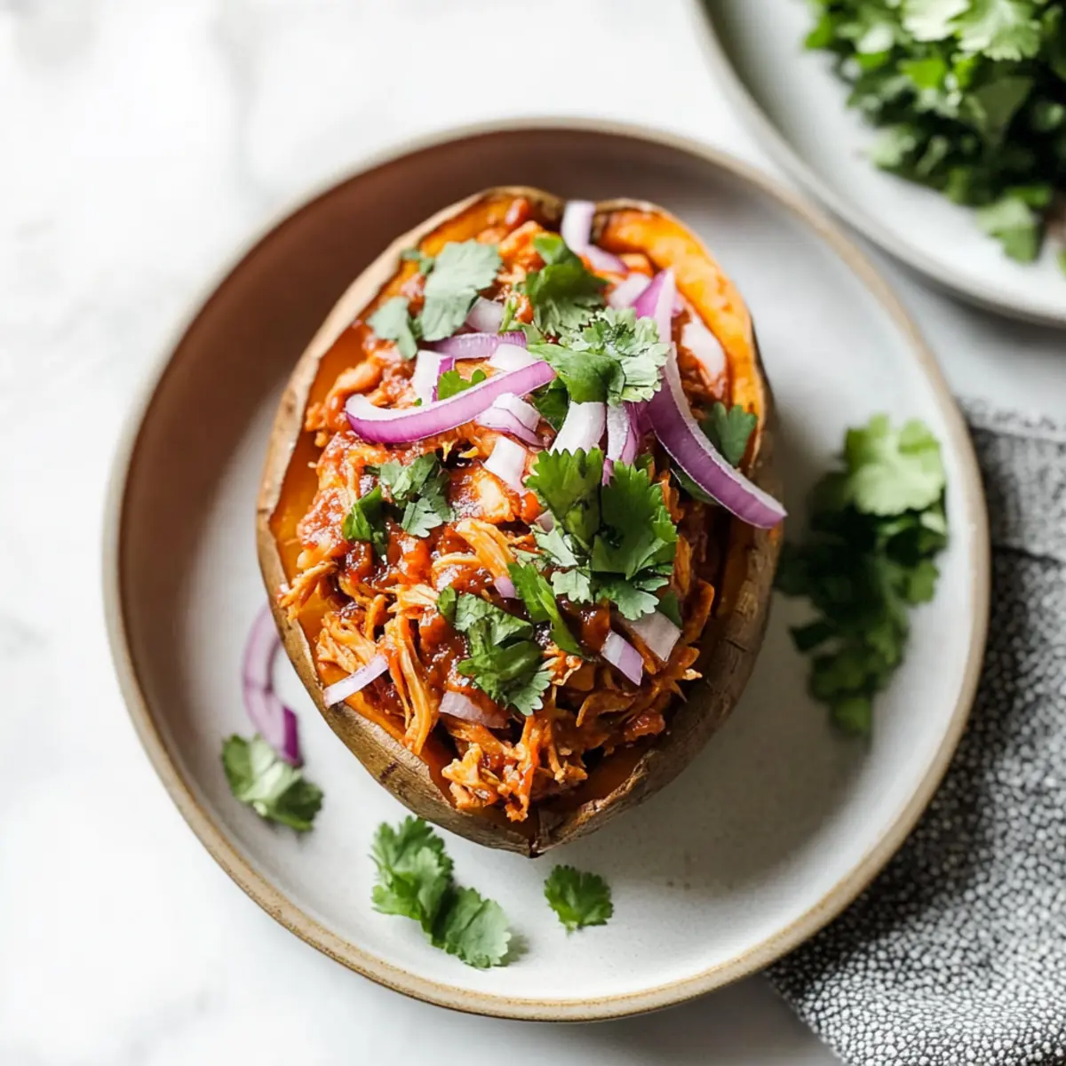 Once all your BBQ chicken stuffed sweet potatoes are filled, sprinkle with sliced red onion for a crunchy topping. Finish with a sprinkle of fresh chopped cilantro for a burst of color and flavor. Serve warm, and enjoy the delightful combination of sweet potato and BBQ goodness.