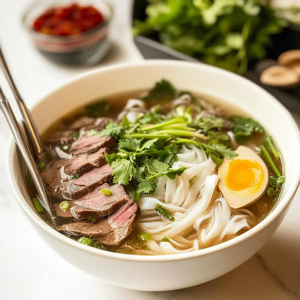 - Assemble the Bowls with cooked rice noodles, sliced beef, and fresh herbs.
