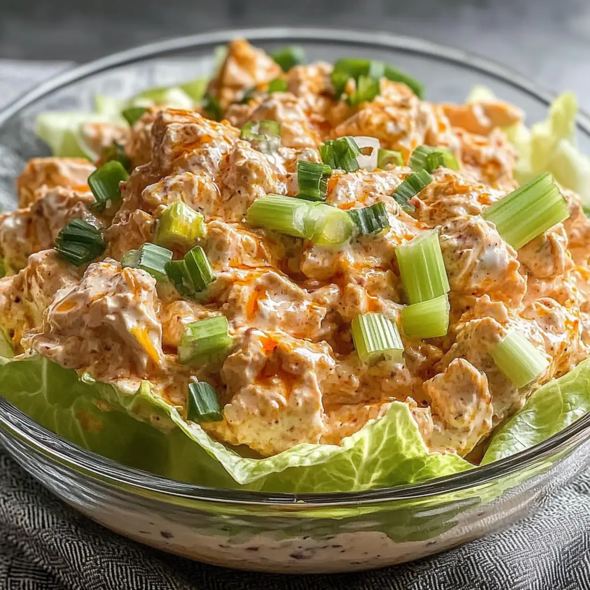 Once seasoned, it’s time to serve your delicious Buffalo Tuna Salad! You can enjoy it plated on whole-wheat toast for a hearty option or spooned into crisp lettuce cups for a low-carb delight. This serving step takes about 2 minutes, and you can garnish it with extra green onions or a drizzle of buffalo sauce for an added touch.