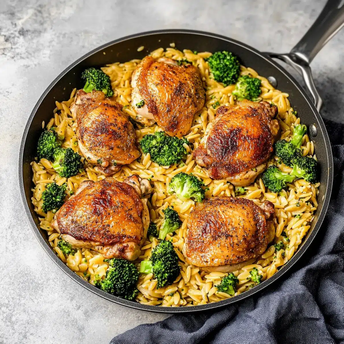 Skillet Chicken Thighs with Cheesy Broccoli Orzo Delight