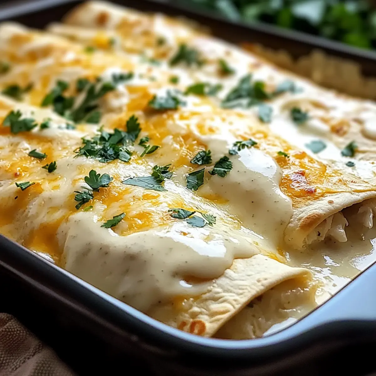 These Creamy White Chicken Enchiladas are perfect for meal prep enthusiasts! You can assemble the enchiladas up to 24 hours in advance. To do this, prepare the filling and rolling process as directed, then cover the baking dish tightly with plastic wrap and refrigerate. To maintain quality, ensure the enchiladas are completely cooled before covering, which prevents sogginess. When you’re ready to bake, simply remove the plastic wrap and pour the remaining white sauce over the top, then bake as instructed. This approach allows you to enjoy delicious, home-cooked enchiladas any night of the week without the last-minute rush, keeping family dinners easy and satisfying!
