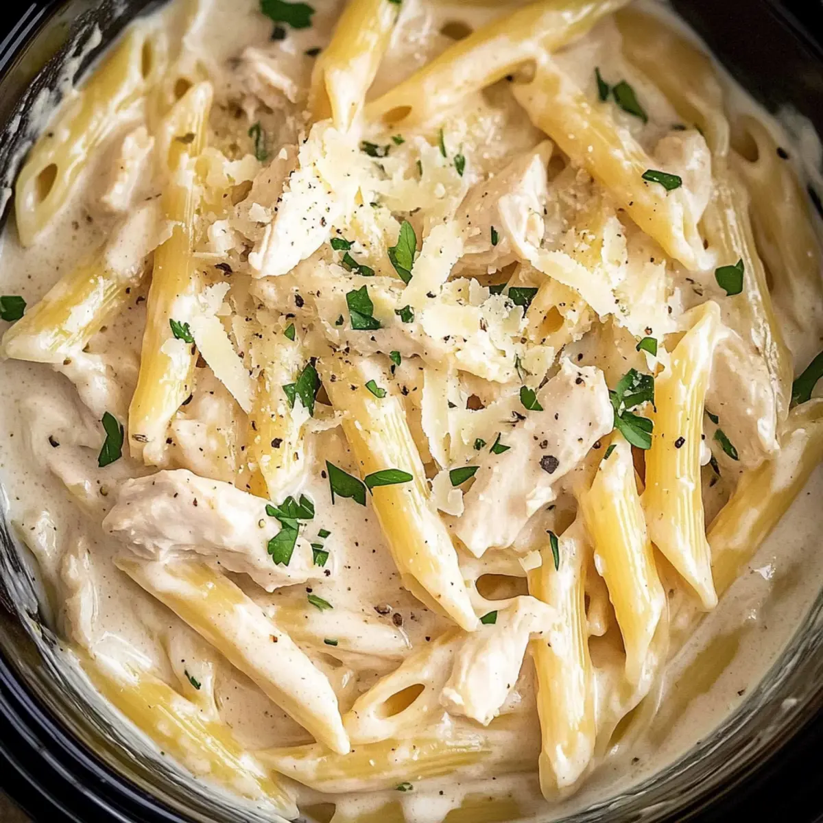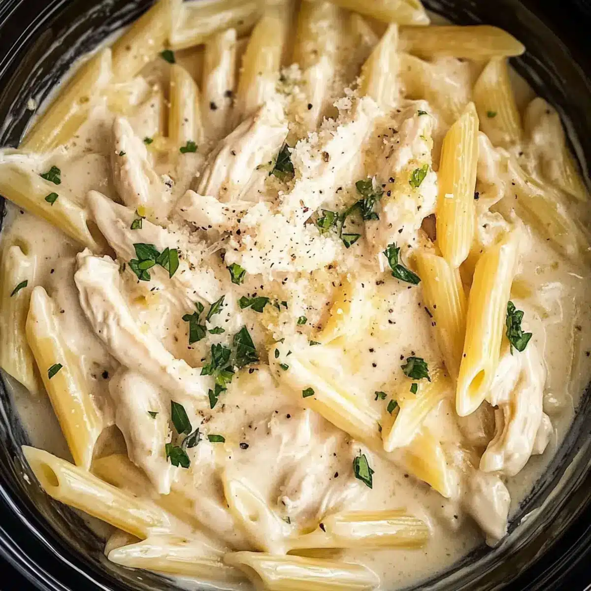 These Crockpot Chicken Alfredo delights are perfect for meal prep enthusiasts! You can prepare the chicken and creamy sauce up to 24 hours in advance by combining the chicken breasts, cream cheese, butter, garlic, and seasonings in the slow cooker, then refrigerating it. Just make sure to keep it covered to maintain freshness. When you’re ready to cook, add the chilled mixture to your slow cooker, pour in the chicken broth and heavy cream, and start the cooking process. The penne pasta can also be pre-measured and stored separately, ensuring perfect al dente texture when added just before serving. This way, you save valuable time on busy weeknights while enjoying restaurant-quality results at home!