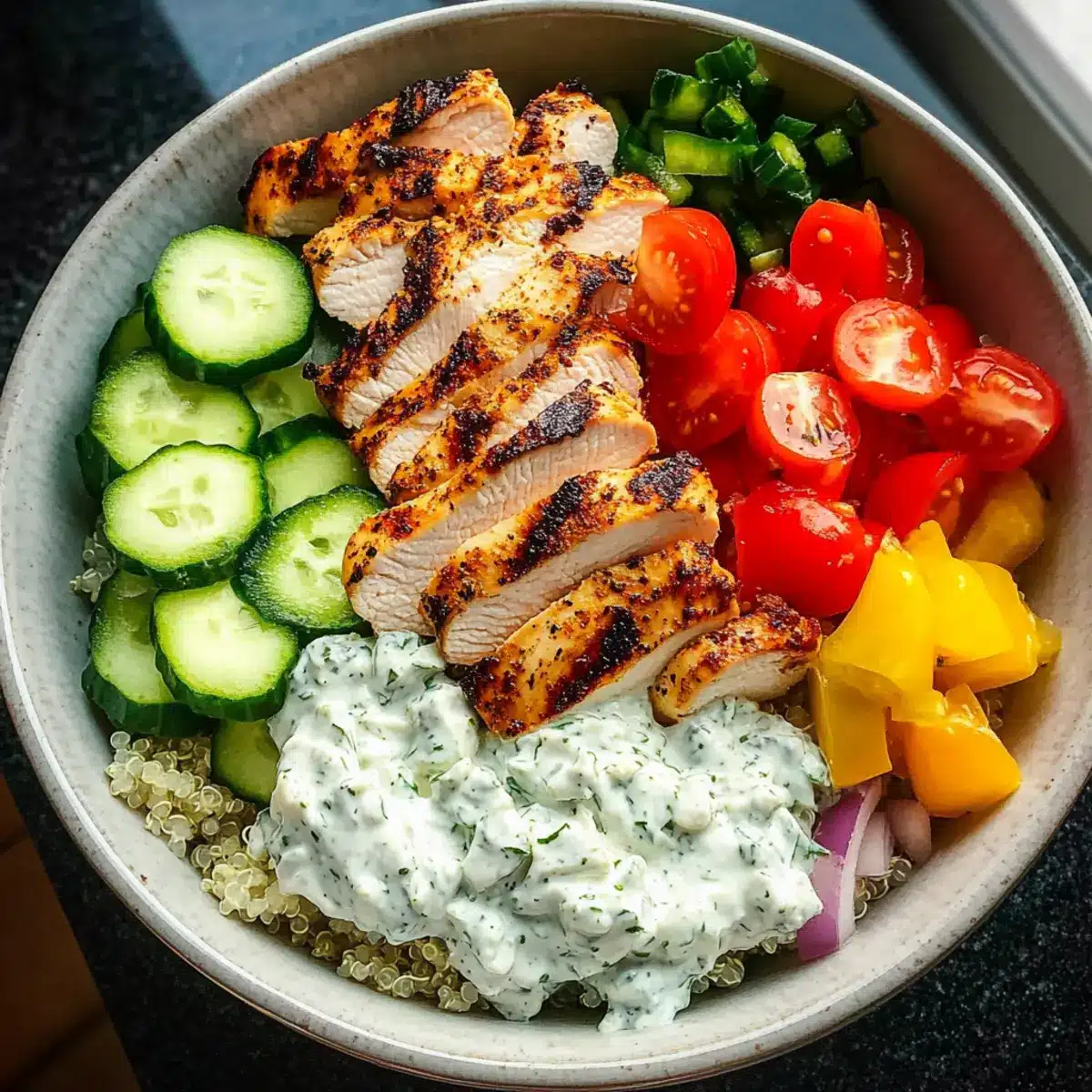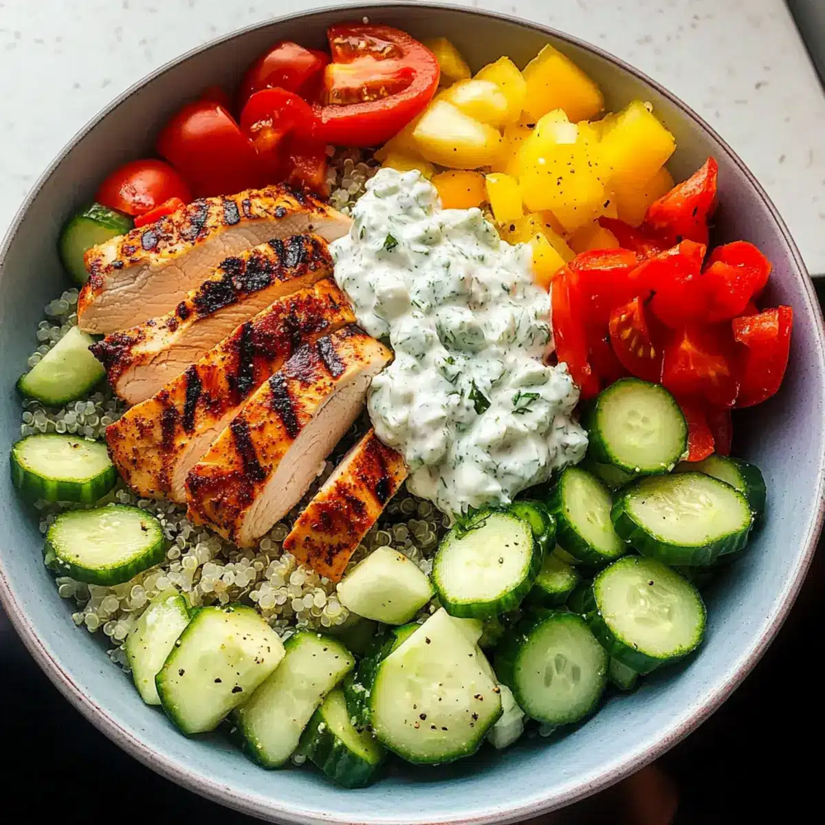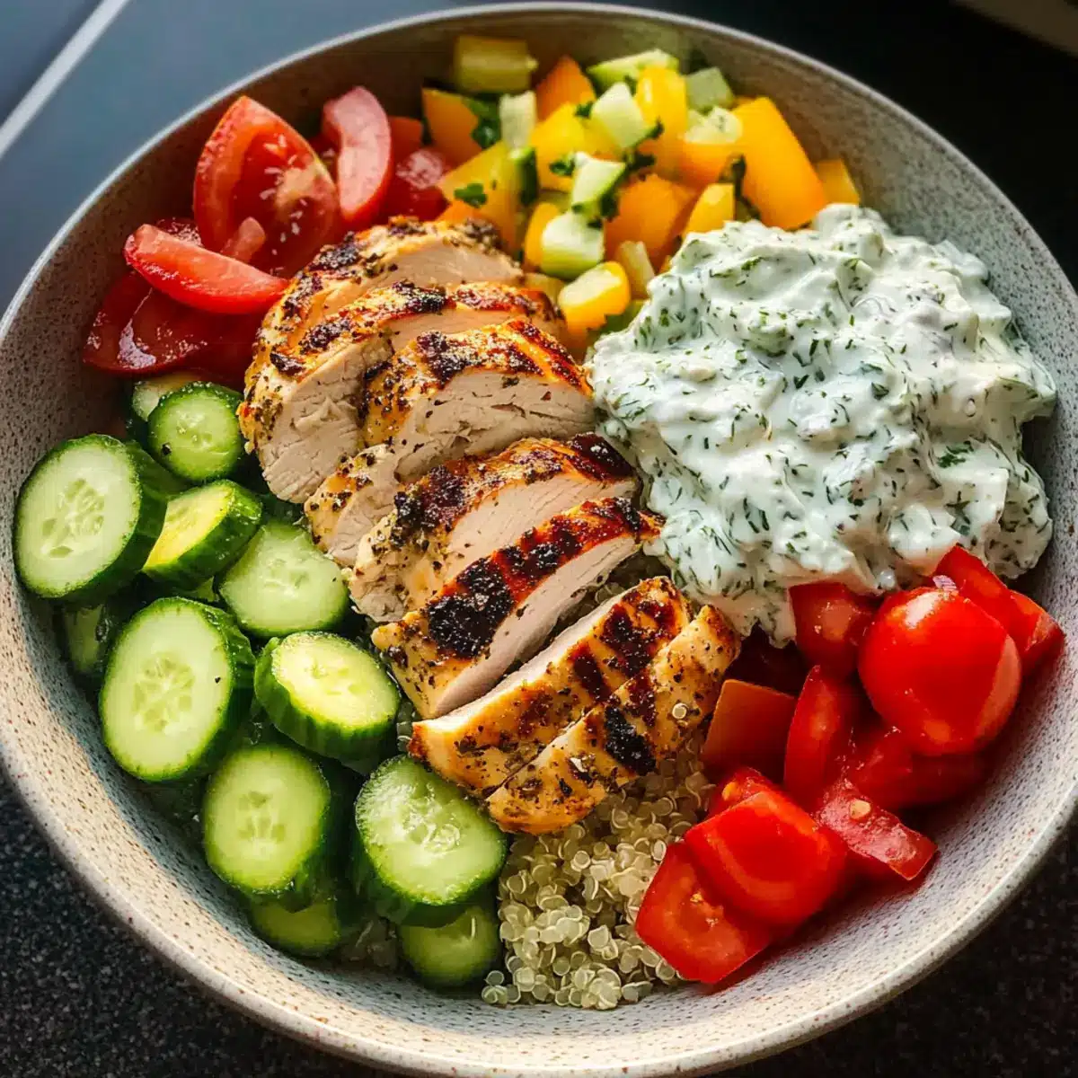 - Assemble the bowls with rice or quinoa, vegetables, sliced chicken, and tzatziki.