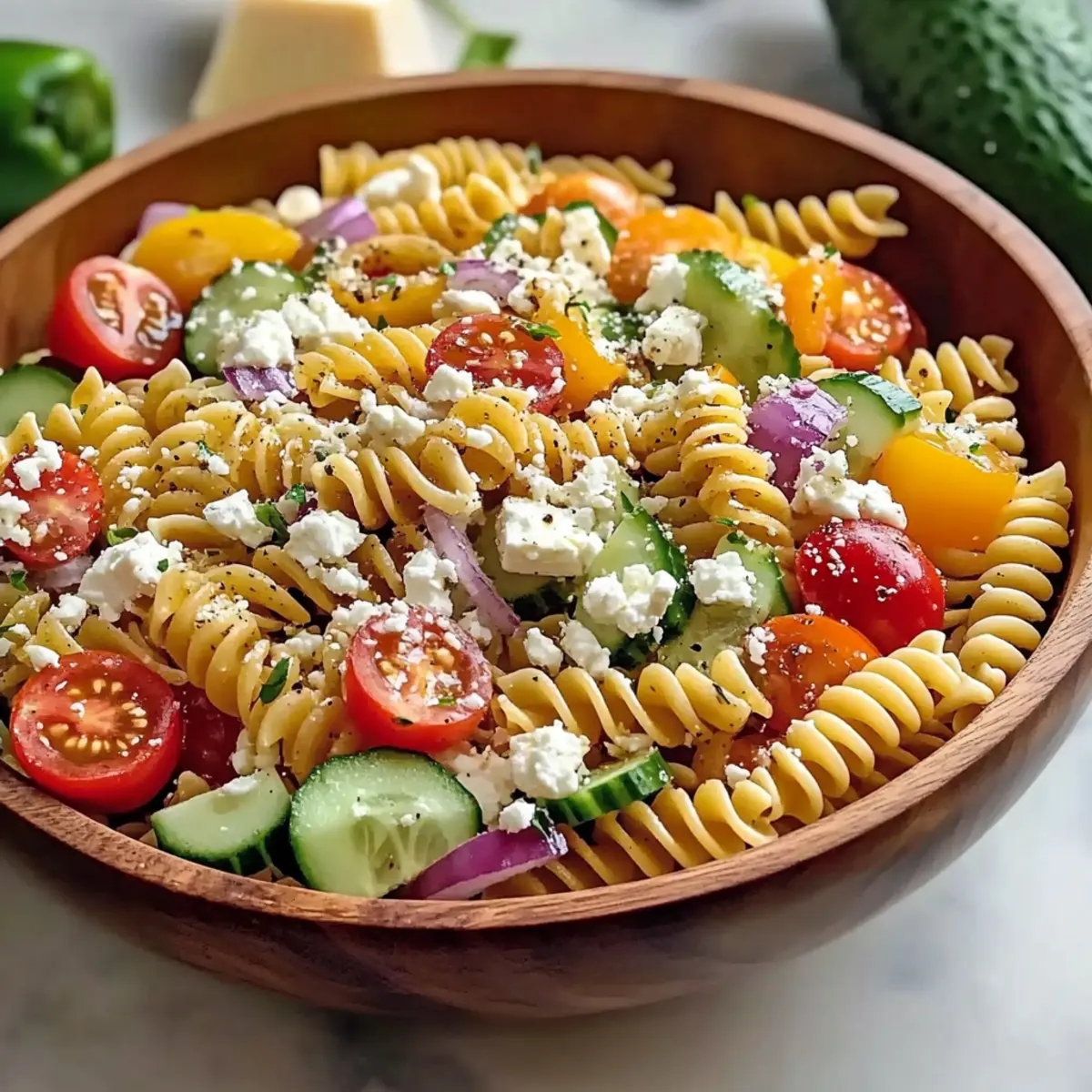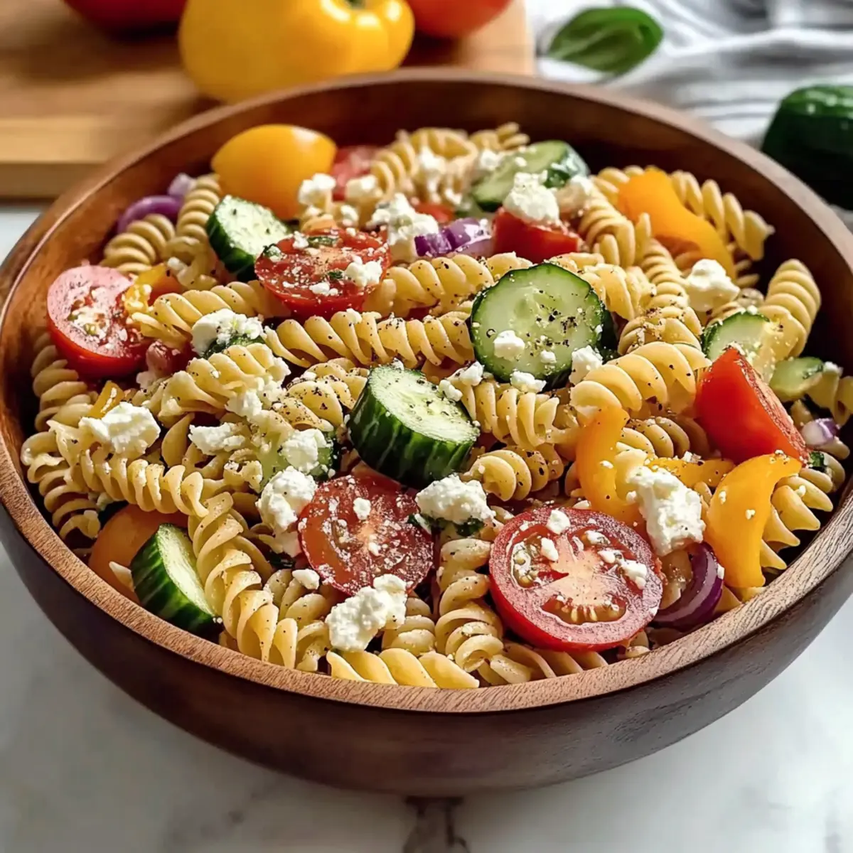- Begin by preparing the fresh vegetables for your High Protein Greek Pasta Salad. Peel and slice the cucumber into ½-inch half-moons, then halve the tomatoes. Dice the red and yellow bell peppers into bite-sized pieces, and quarter and thinly slice the red onion. Aim for uniform sizes for consistent texture and flavor throughout the salad.
