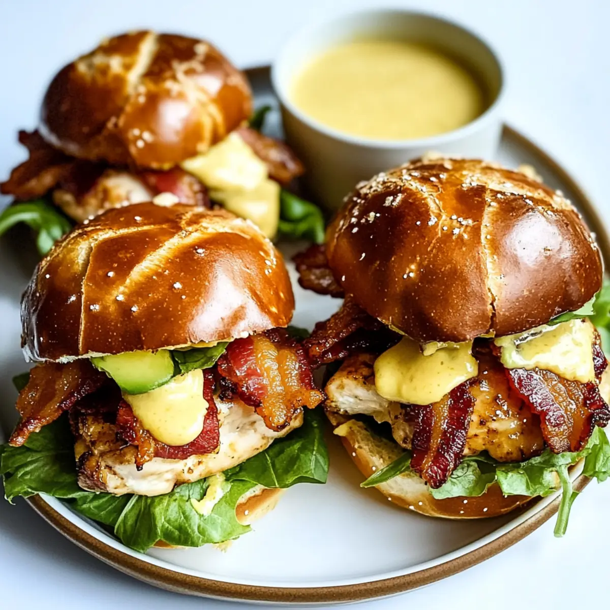 Finally, place the top half of the pretzel buns on the assembled ingredients to close each slider. Feel free to serve these scrumptious Honey Mustard BLT Chicken Sliders with dipping bowls of extra honey mustard on the side. The delightful combination of flavors and textures will make these sliders a hit at your gathering!