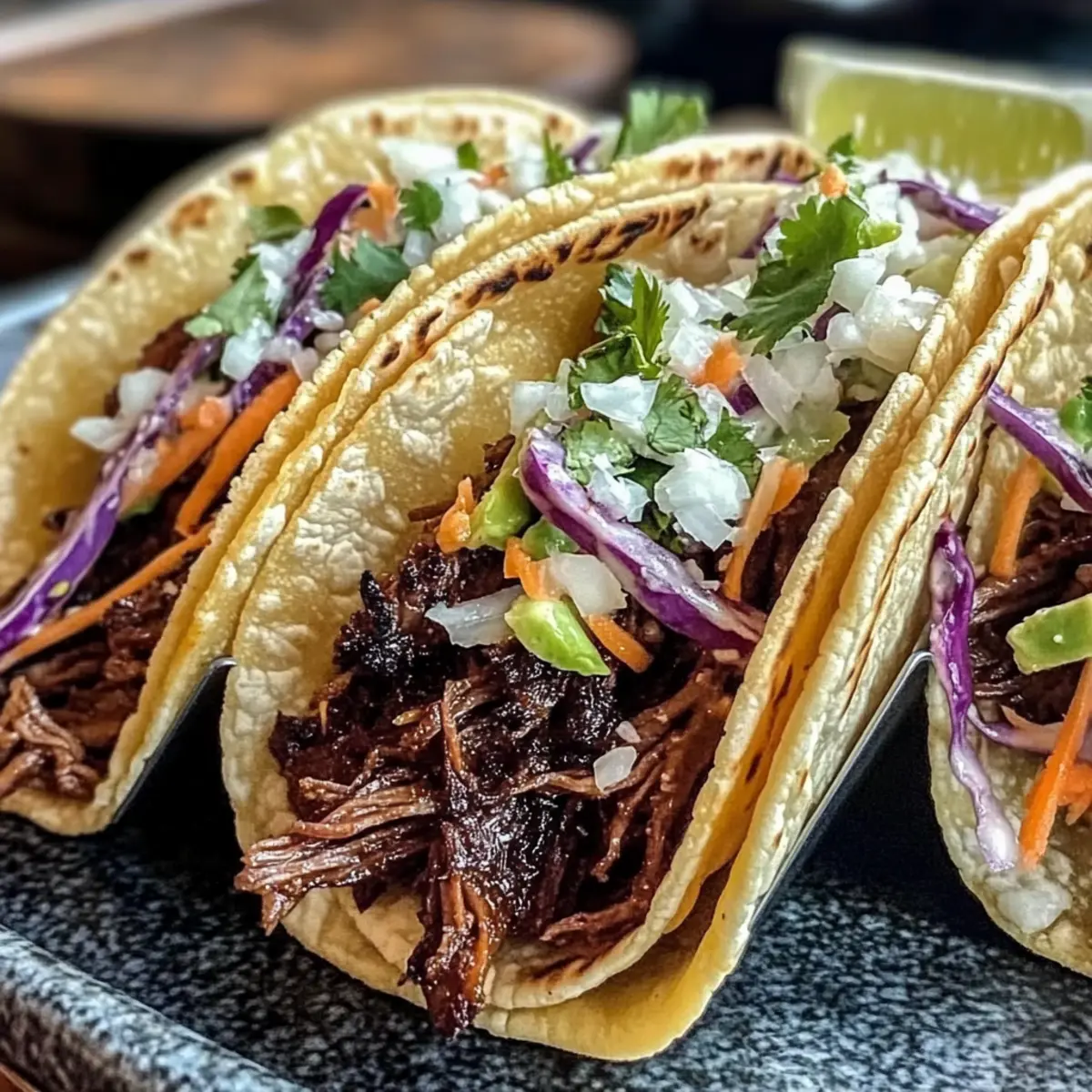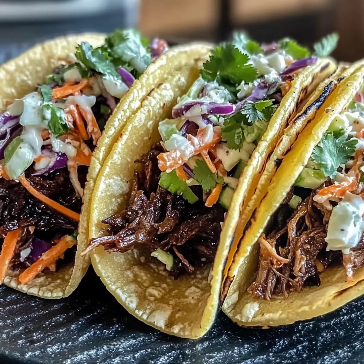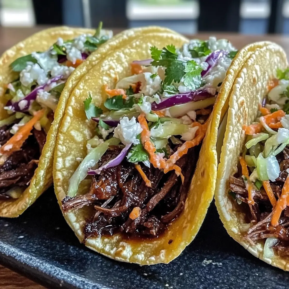 Ultimate Comfort Food: Experience the melt-in-your-mouth tenderness of slow-cooked beef paired with fresh gochujang slaw for a delightful contrast that elevates your taco game.