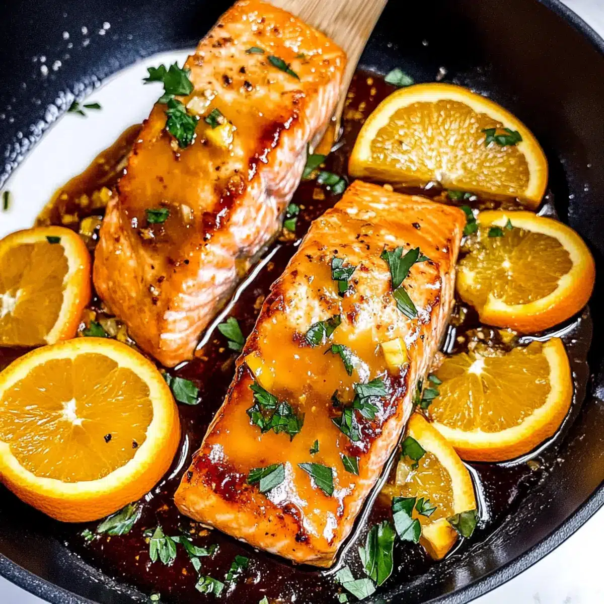Carefully return the cooked salmon fillets to the skillet, coating them generously with the thickened glaze. Let them cook for another minute in the sauce, allowing the flavors to meld together, and feel free to add fresh orange slices for extra color and decoration.