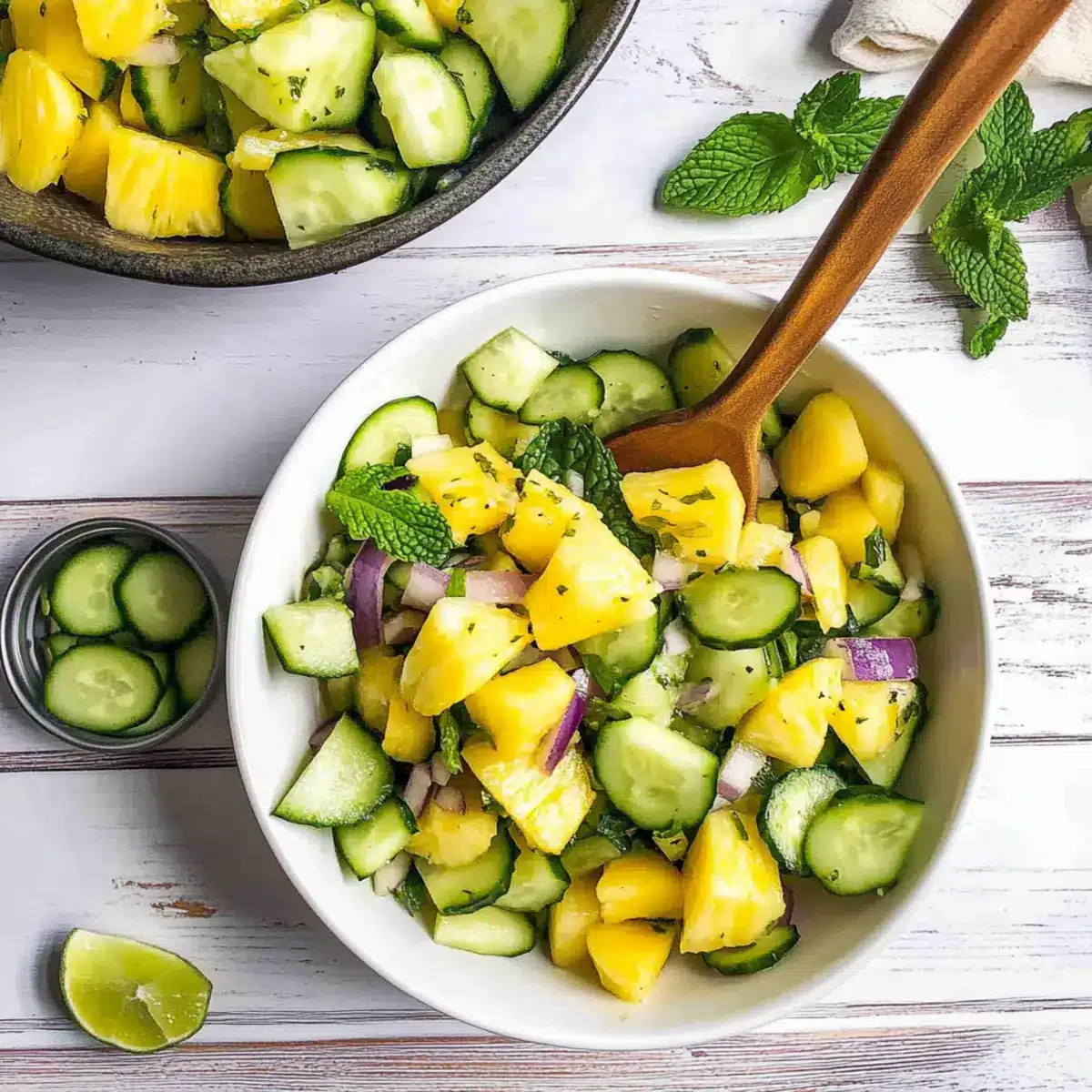 If you like a little zing, thinly slice a small amount of red onion and toss it into the bowl with the pineapple and cucumber. The onion’s sharpness adds depth without overpowering the tropical sweetness. You can also include fresh mint leaves or cilantro to enhance the salad’s aroma and flavor; roughly chop them and add to the mix.