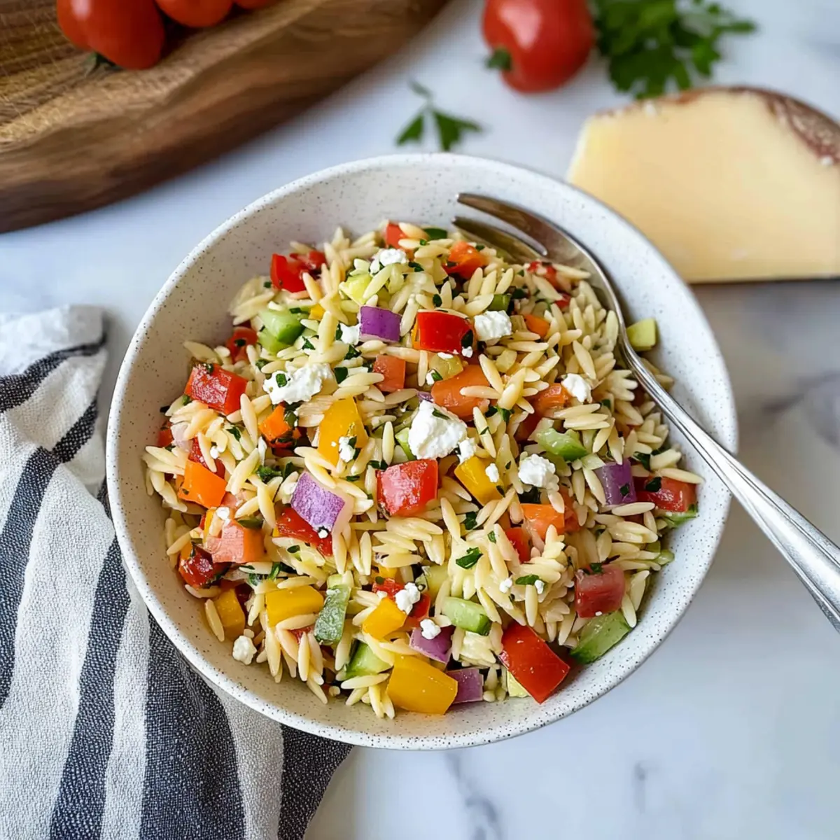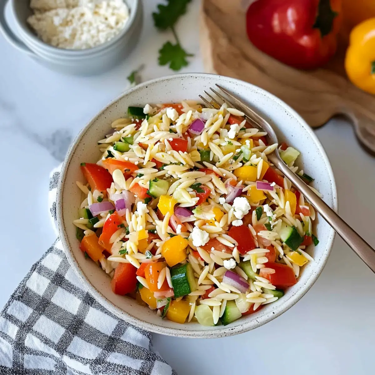- In the large bowl with your prepped vegetables, add the cooled orzo along with crumbled feta cheese for a creamy touch. Gently stir everything together, ensuring each element is evenly distributed.