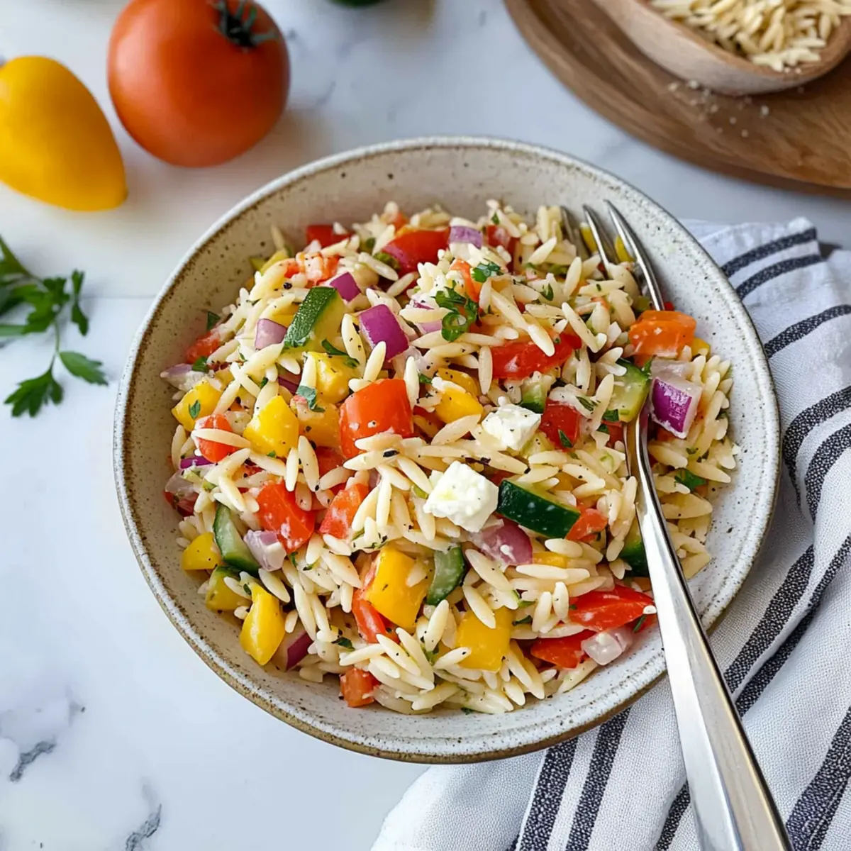 If your orzo pasta tends to clump together, make sure to rinse it under cold water thoroughly after draining. This helps cool it down quickly and stops further cooking. Another tip: when mixing the vegetables and orzo, it helps to use a gentle tossing motion to keep everything intact and evenly mixed without mashing the ingredients. And remember, if you find your salad too dry after storing, just add a bit more dressing to bring it back to life!