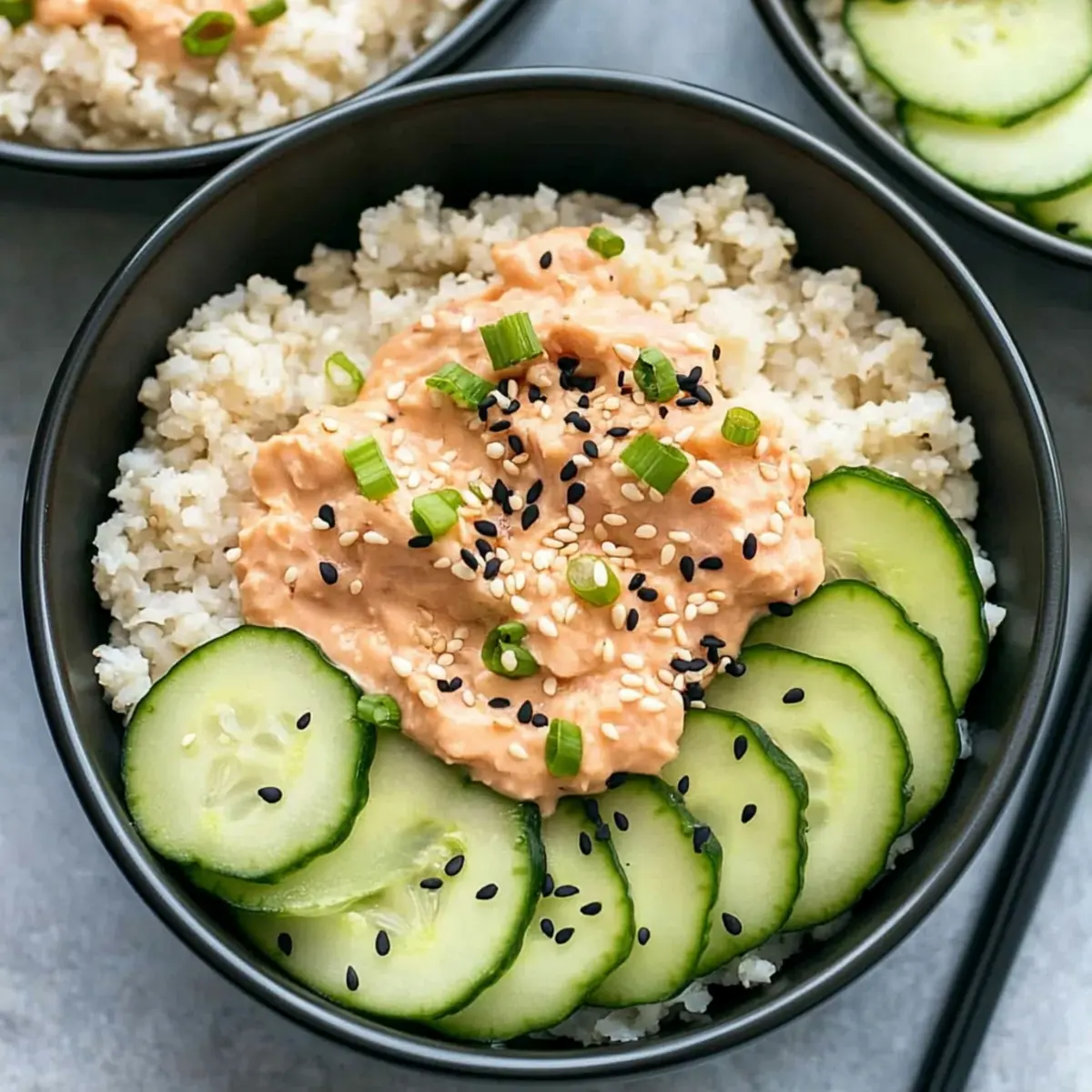 Sesame Cucumber Salad: Bright and tangy, this salad brings a fresh and zesty flavor that balances the richness of the spicy mayo tuna.