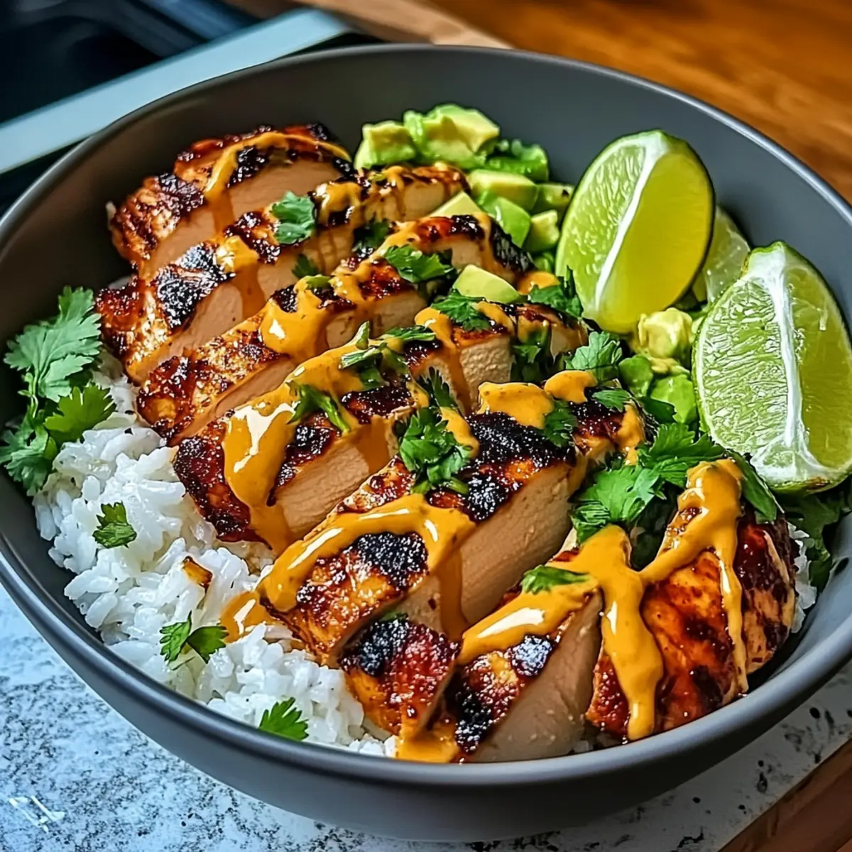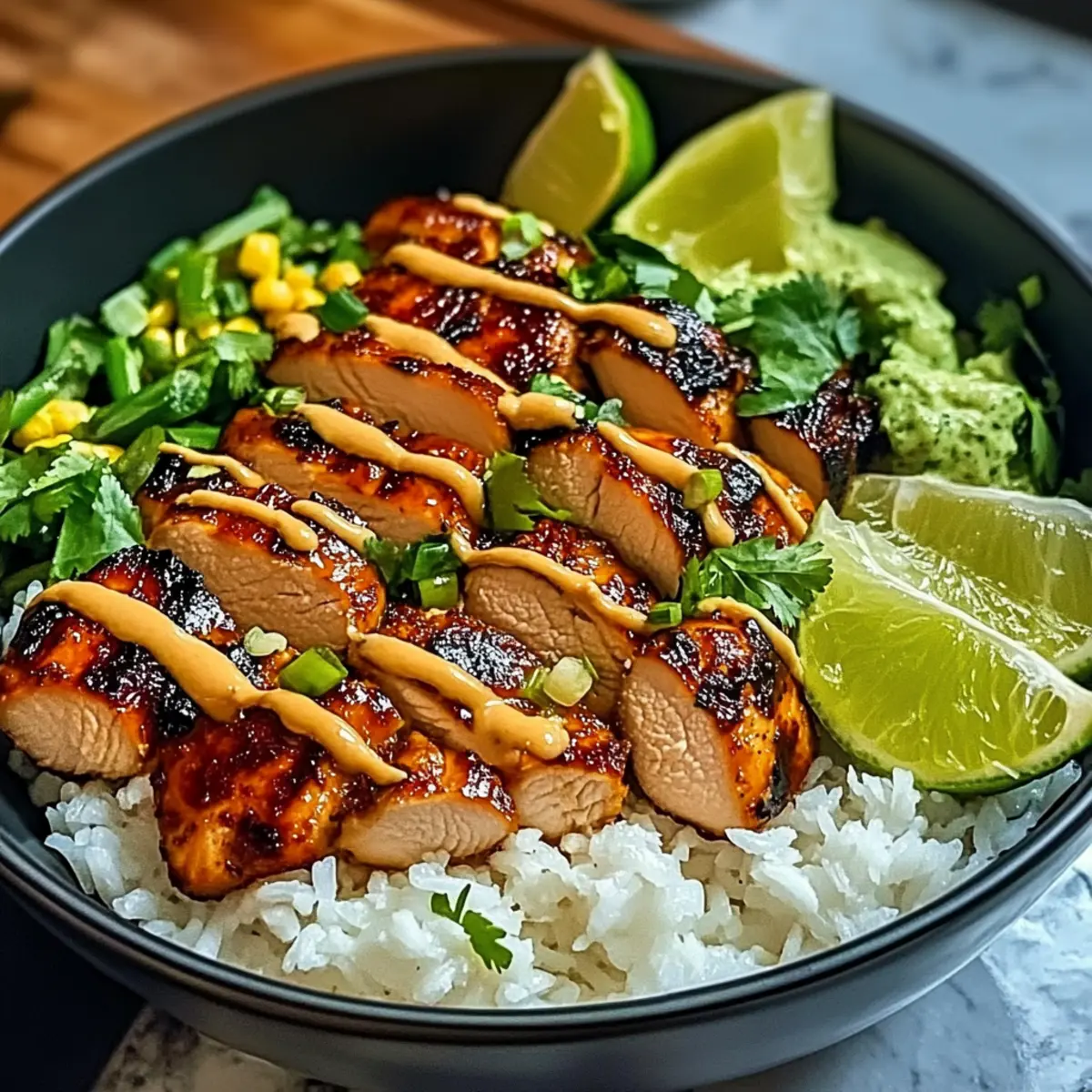 - Assemble bowls with jasmine rice as the base, topped with sliced chicken, drizzled with coconut lime sauce, and garnished with cilantro, lime wedges, and chili flakes.